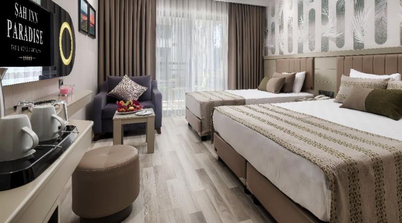 Şahinn Paradise herşey dahil açık büfe konsepti ve 5 yıldızlı olma özelliğiyle lüks tatil anlayışınızı üst çıtalara taşırken yeşilliğin içinde eşsiz manzarası ile beklediğiniz huzuru size sağlıyor. 4’ü kral dairesi, 5’i engelli, 100’ü aile ve 295’i standart toplam 404 oda ve 1400 yatak kapasitesi siz değerli konuklarımız için tasarlanmış otelimizde balkon mini bar, direkt telefon, kablosuz internet, TV, bilgi kanalı, split klima, kasa, seramik zemin, küvet/wc ve saç kurutma makinesi bulunmaktadır.